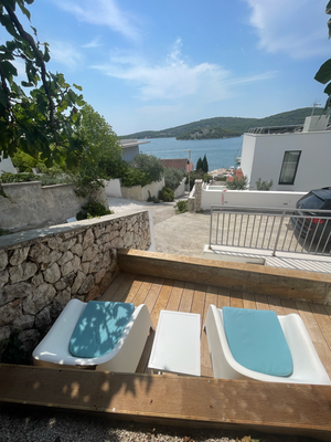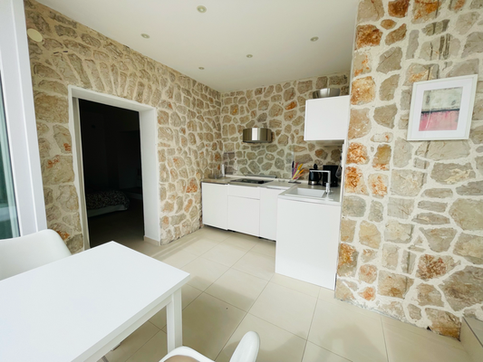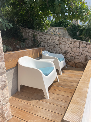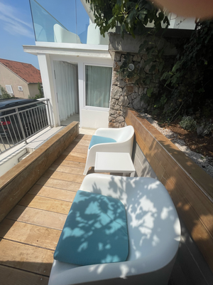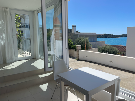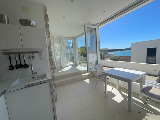 Essplatz für 2 Personen mit komplett zu öffnender Fensterfront zum Meer